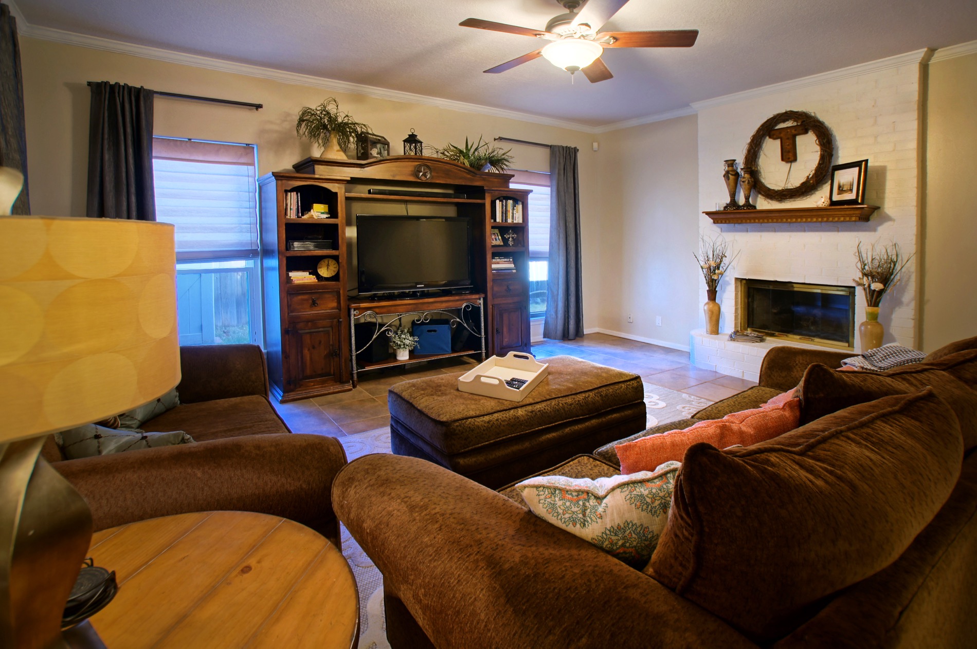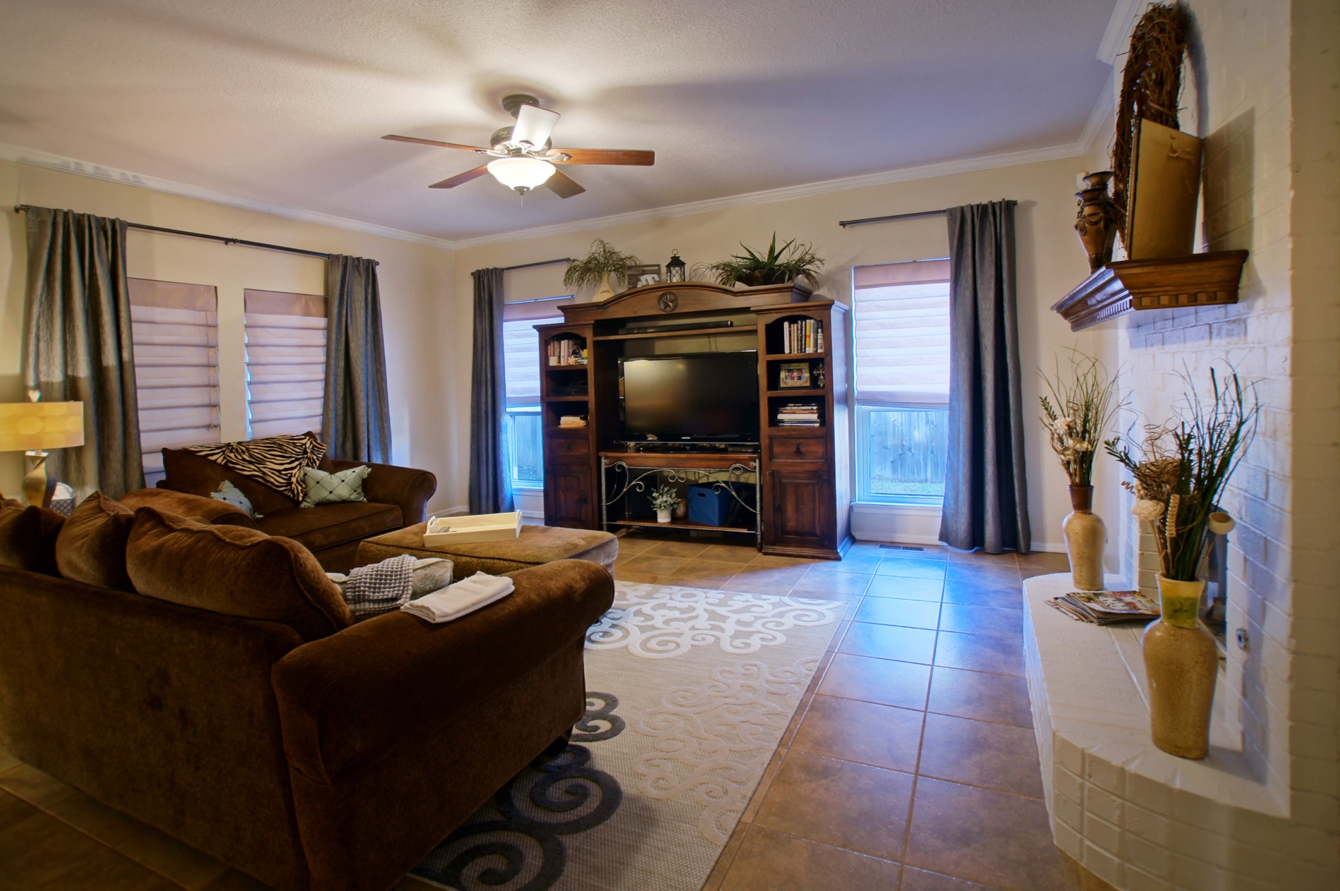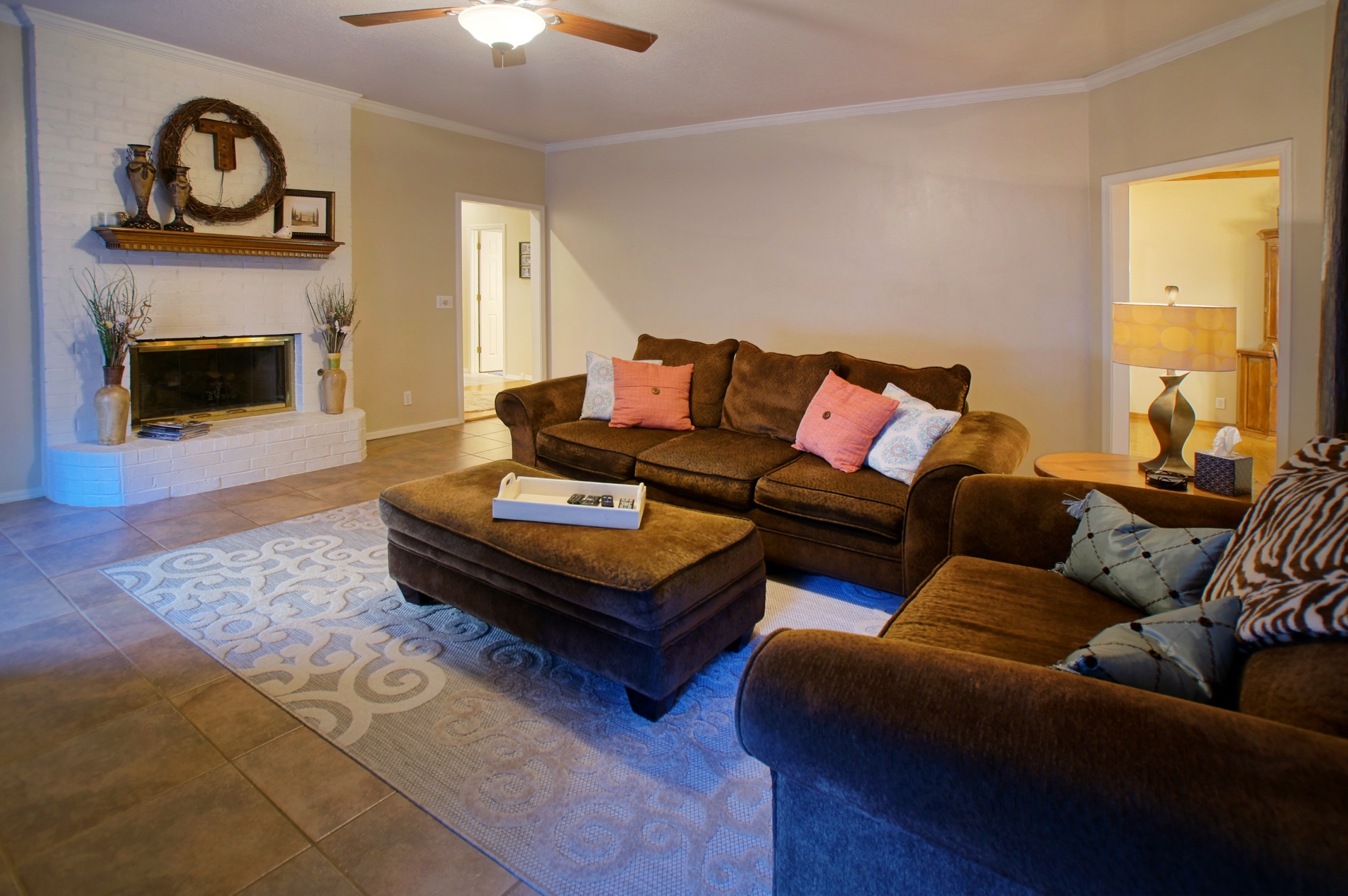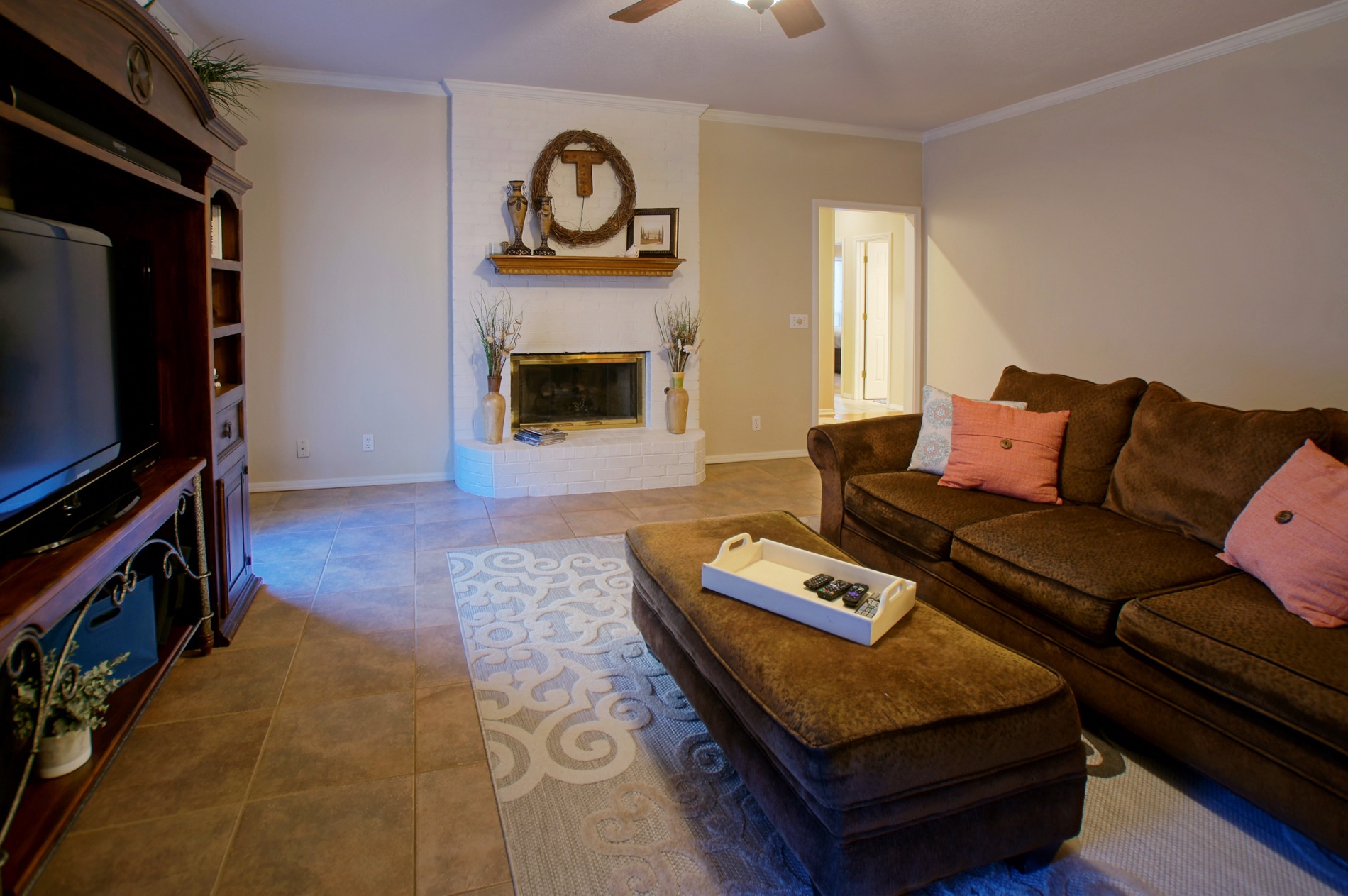 The family room is very spacious and is accented by a fireplace with gas logs.
